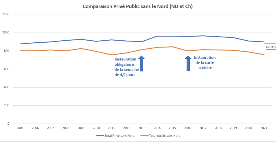 D’aucuns prétendent que le déséquilibre public/privé à Vitré est dû à la différence de rythme scolaire. Les 4 jours et demi auraient provoqué une hémorragie vers le privé. Si on regarde les chiffres, cette explication ne tient pas. Regardons l’évolution comparée du public et du privé, en excluant les deux écoles concernées par le Nord.