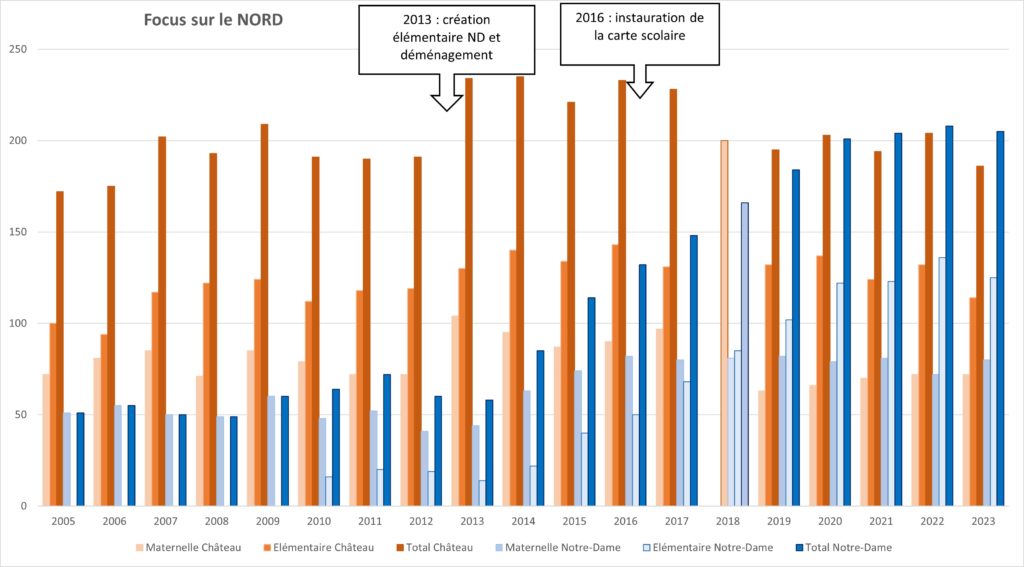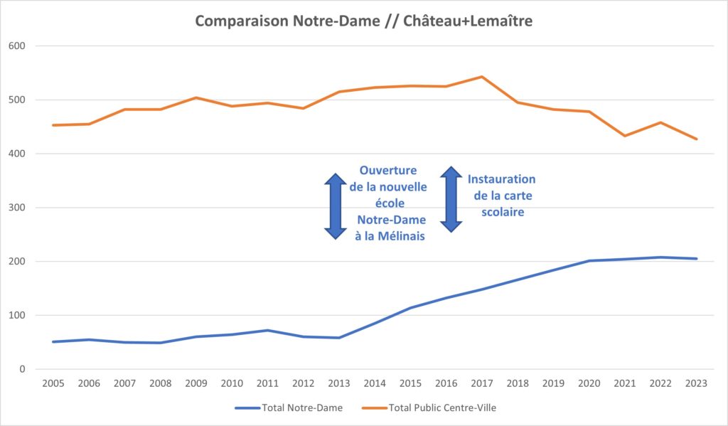 On voit apparaître l’envolée des effectifs de Notre-Dame à partir de l’inauguration de la nouvelle structure à la Mélinais, et la baisse des effectifs de l’école du château et de Pierre Lemaître à partir de 2016, année de l’instauration de la carte scolaire…