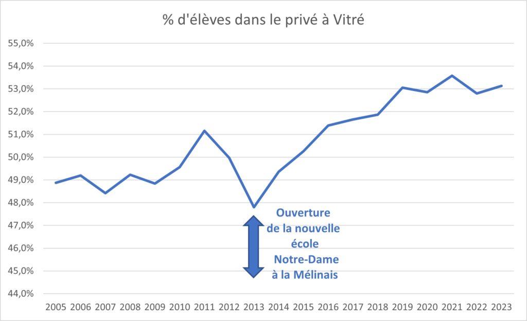 L’écart qui apparaît est soutenu essentiellement par les effectifs du Nord de Vitré, où l’école Notre-Dame est installée en situation de monopole de fait, tant l’école du Château dont le Nord dépend. La situation géographique des deux écoles étant complètement opposée :